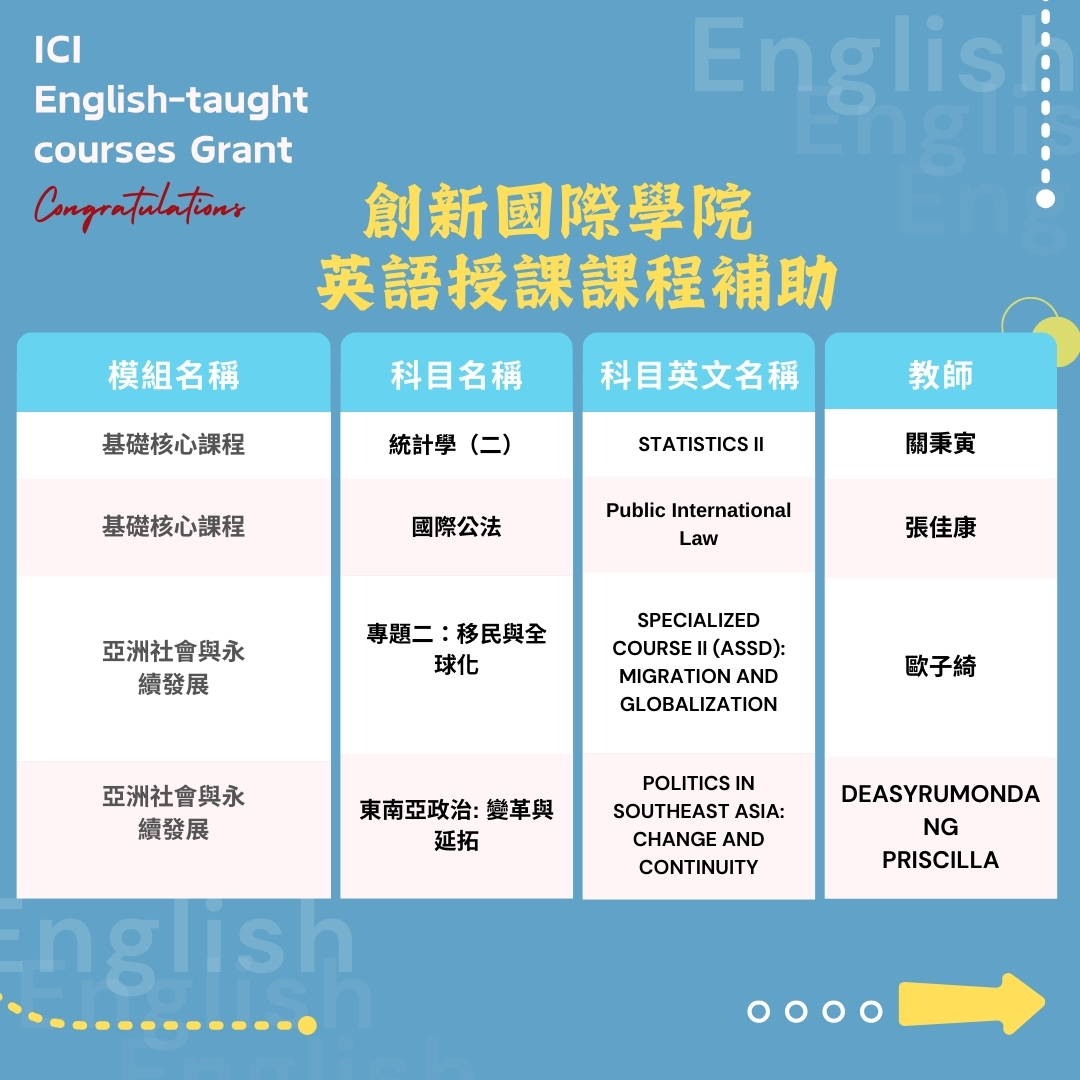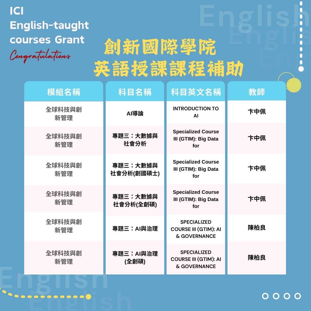 「英語授課課程補助」旨在提升學校英語授課的品質,並推動高等教育與國際接軌。申請該補助的條件要求各學院每年必須提交英語授課規劃書,經由審查委員會審核後決定是否核准補助。創新國際學院很榮幸能夠獲得此次補助,這是對學院在英語授課領域持續投入與創新的一種肯定。
