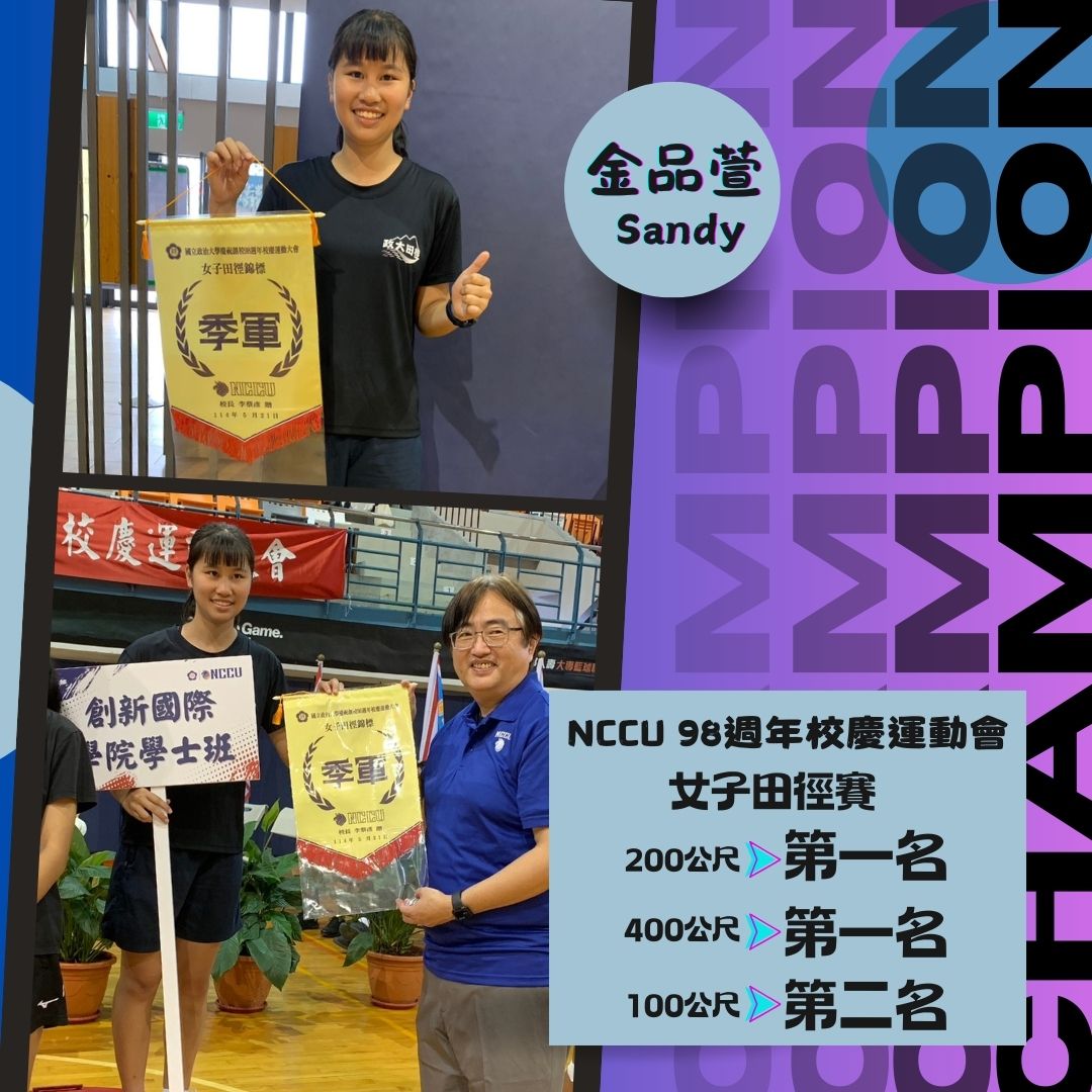 本院學生金品萱同學於國立政治大學第98週年校慶運動會中表現優異,在女子田徑項目中勇奪佳績,成績如下: 女子400公尺賽跑|第一名 女子200公尺賽跑|第一名 女子100公尺短跑|第二名 金同學在賽場上的傑出表現,展現出卓越的運動實力與堅毅精神,不僅為創新國際學院爭光,也激勵更多同學勇於挑戰自我、探索潛能。 本院對金品萱同學表達誠摯祝賀,並期許更多學生參與校內各項活動,豐富學習歷程,在多元舞台上發揮所長。