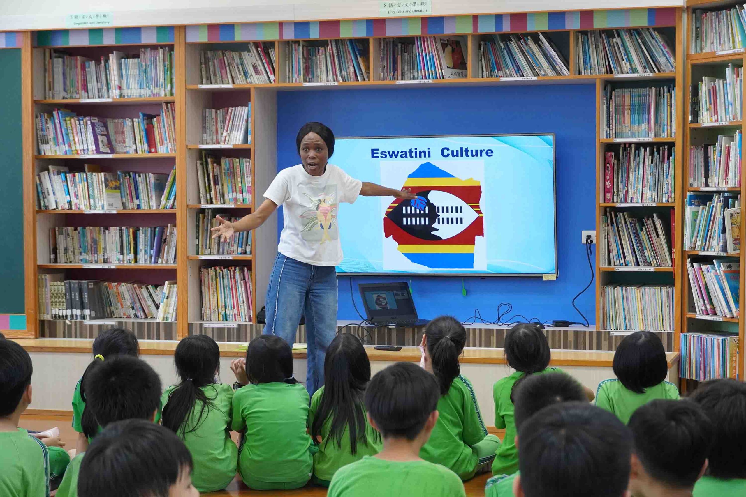 實踐國小來自史瓦帝尼的老師也活潑地向學生們介紹史瓦帝尼的文化。(圖片來源:創新國際學院)