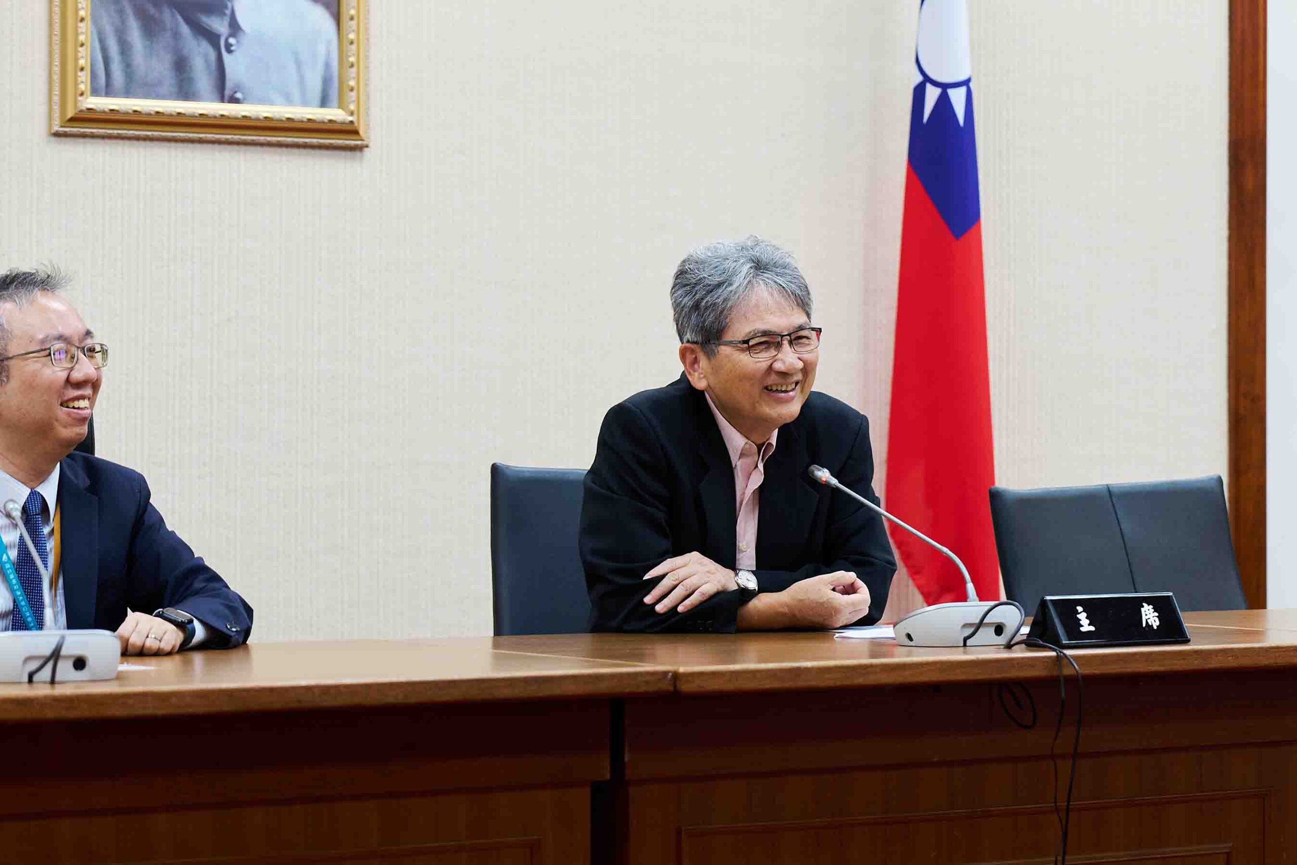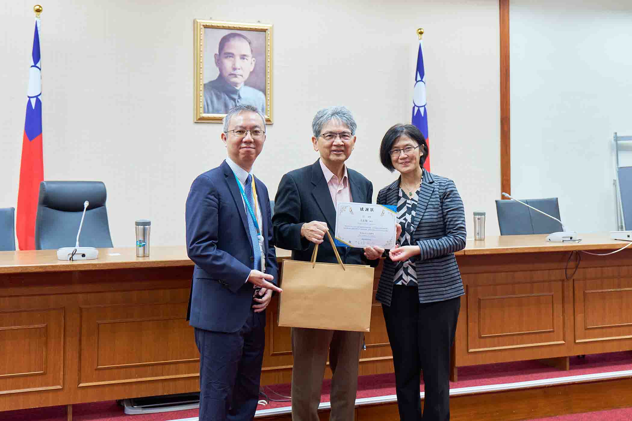 創新國際學院杜文苓院長(右一)致贈感謝狀與紀念禮品予立法委員王正旭(左一),感謝立法院對本次教學參訪活動的支持與協助。(圖片來源:創新國際學院)